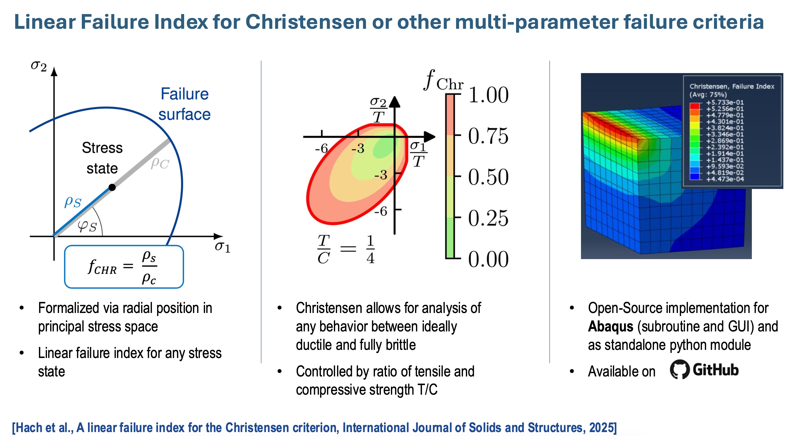 Das Christensen Kriterium - einigen vielleicht aus der Lehrveranstaltung Leichtbauwerkstoffe ein Begriff - ergänzen wir um einen linearen Versagensindex , der beide Subkriterien beinhaltet und in seiner Aussagekraft der Vergleichsspannung wie z.B. von Mises ähnelt - aber eben auch für nicht ideal duktile Werkstoffe funktioniert. Mit dem Paper wurde auch der https://github.com/cld-rostock/Christensen_FailureIndex veröffentlicht, der diesen linearen Versagensindex allgemein in Python und spezifisch in der FE-Software Abaqus implementiert.