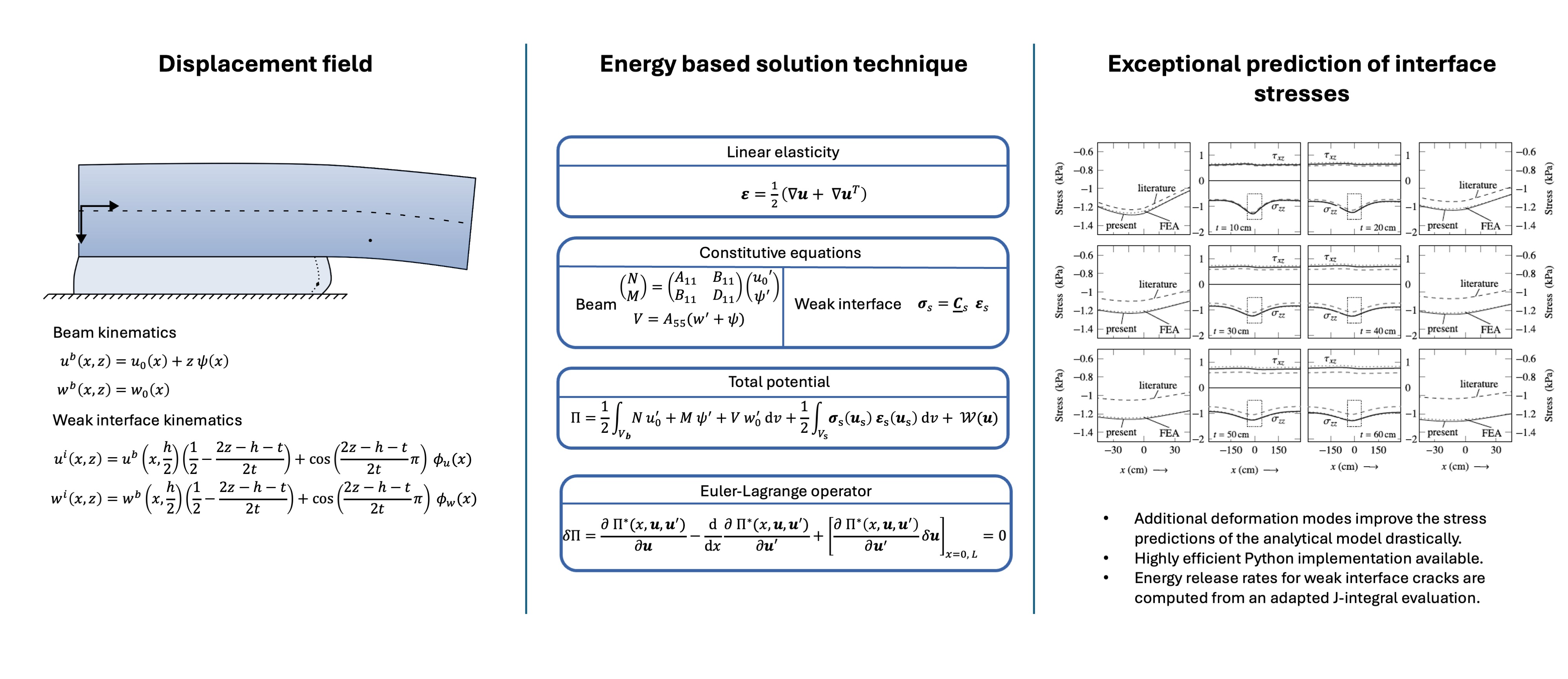 Viele Systeme besitzen nachgiebige, teils dicke Schwachschichten (z.B. Klebschichten oder Schneeschwachlagen), in denen klassische Interface-Modelle versagen. Wir stellen ein variationales, energie-basiertes Modell vor, das nichtuniforme Spannungs- und Verschiebungsfelder in der Schicht zuverlässig erfasst. Daraus leiten wir eine geschlossene Formel für die Energiefreisetzungsrate von Interface-Rissen ab und validieren die Vorhersagen gegen Abaqus-FE-Simulationen.